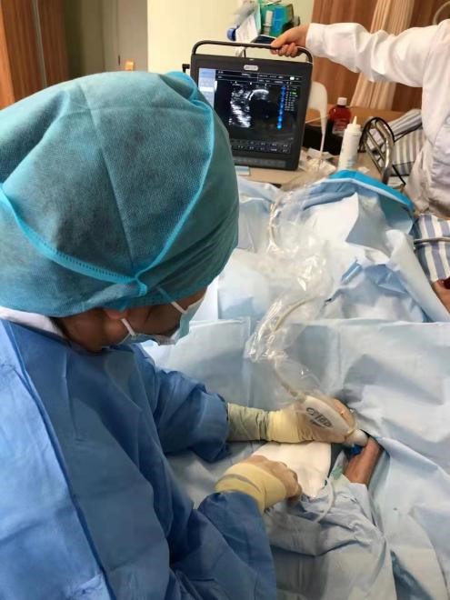 接到会诊后,苏州市独墅湖医院(苏州大学附属独墅湖医院)护理部王洁主任立即通知静脉治疗护理组组长赵丹护士长。赵丹护士长组织静脉治疗门诊周菊珍和陈秋萍两名经验丰富的静疗专科护士,携带便携式超声进行会诊。两位专科护士认真评估患者病情、血常规、凝血四项、D-二聚体及血管情况后,凭借高水平的技术,耐心调整,克服重重困难,顺利完成PICC置管,解决了赵阿婆的静脉输液难题。置管结束后,两位老师也与星湖医院医护人员交流PICC置管及维护经验,对医护人员提出的问题给予了详细、专业的解答。