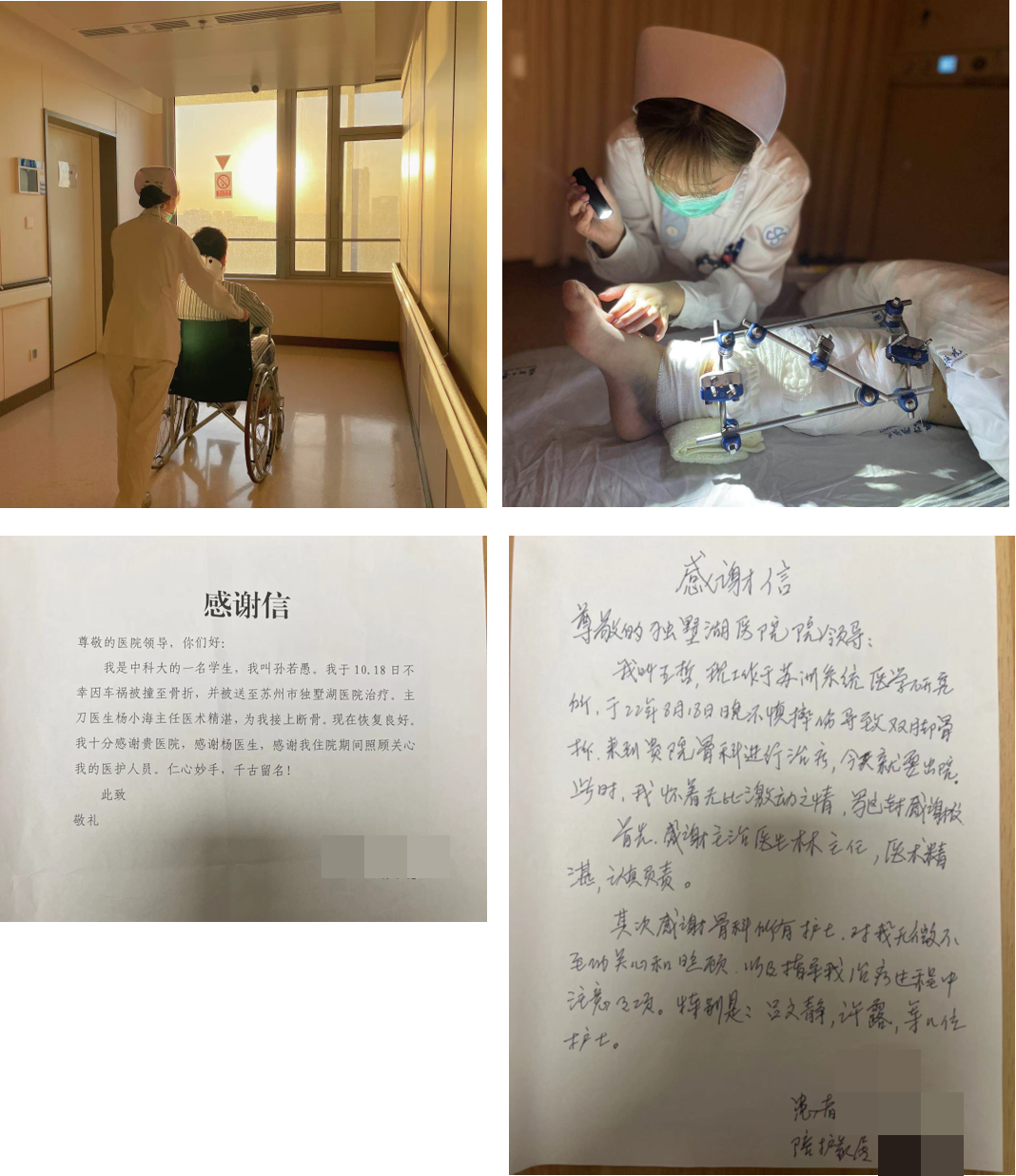 独墅湖医院骨科护理团队以“善心、爱心、热心、耐心、尽心”的“五心服务”原则贯彻所有护理工作,从细节出发,创新护理意识,不断优化护理质量。科室建立专科疾病的围术期康复规范流程,提供多样化温馨提示卡、健康宣教手册、宣教视频以及微信群等,通过推进无痛、防栓关爱病房的理念,使医、护、患三方紧密结合,保障患者的生命安全和身体健康,将科室全体的“责任指数”转化成患者的“满意指数”,使患者体验持续优化,全年无投诉和医疗差错,满意度达98%以上。近年来,多次收到来自患者及家属的锦旗和感谢信!