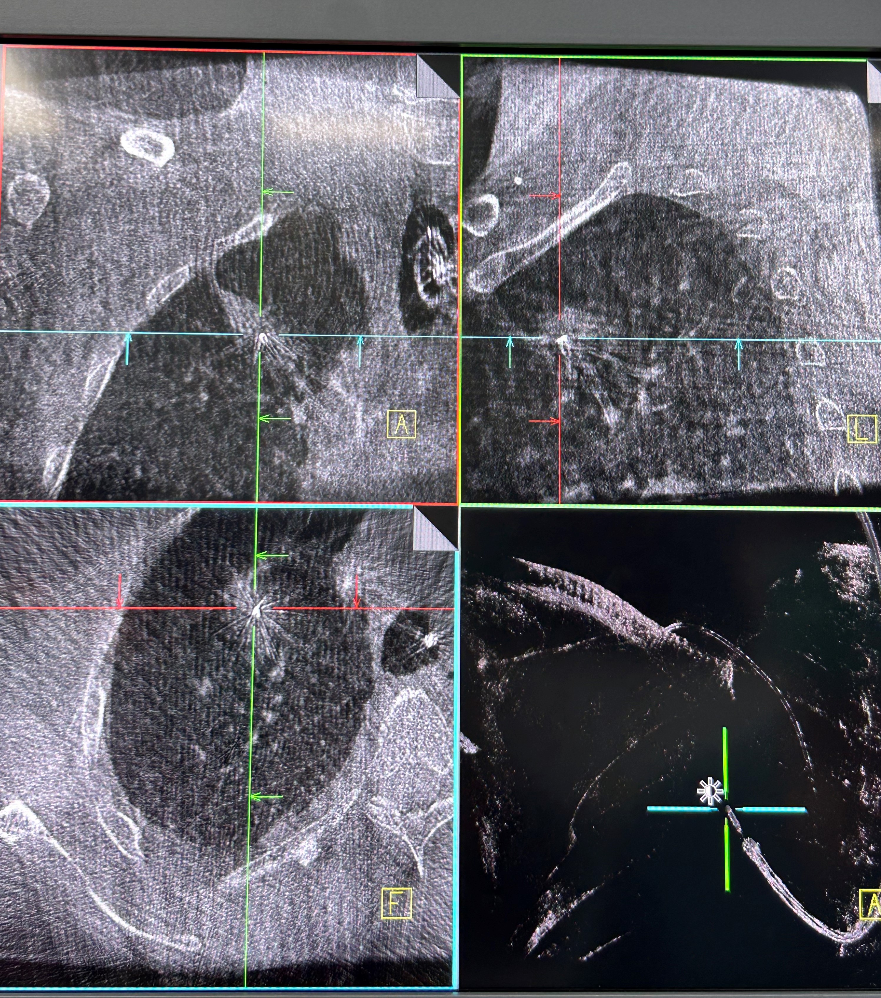 明确肿瘤诊断后,治疗方案即刻启动。团队经导航引导鞘管,精准插入一次性冷冻消融针(直径仅1.9mm)。再次通过CBCT确认消融针完全“扎根”于右上叶尖段病灶内后,开启冷冻治疗模式:以-160℃深低温冷冻10分钟、复温至45℃维持3分钟为一个治疗循环。完成了3次循环后,为确保病灶无遗漏,团队微调消融针位置,再次追加2次循环治疗。术后复查CBCT显示,病灶已呈现典型的冷冻后改变,术后两天复查胸部CT提示消融范围满意,治疗效果完全达到预期。整个手术过程中,患者生命体征始终平稳,术后第二天即可下床活动,真正实现了“微创治疗、快速恢复”的目标。