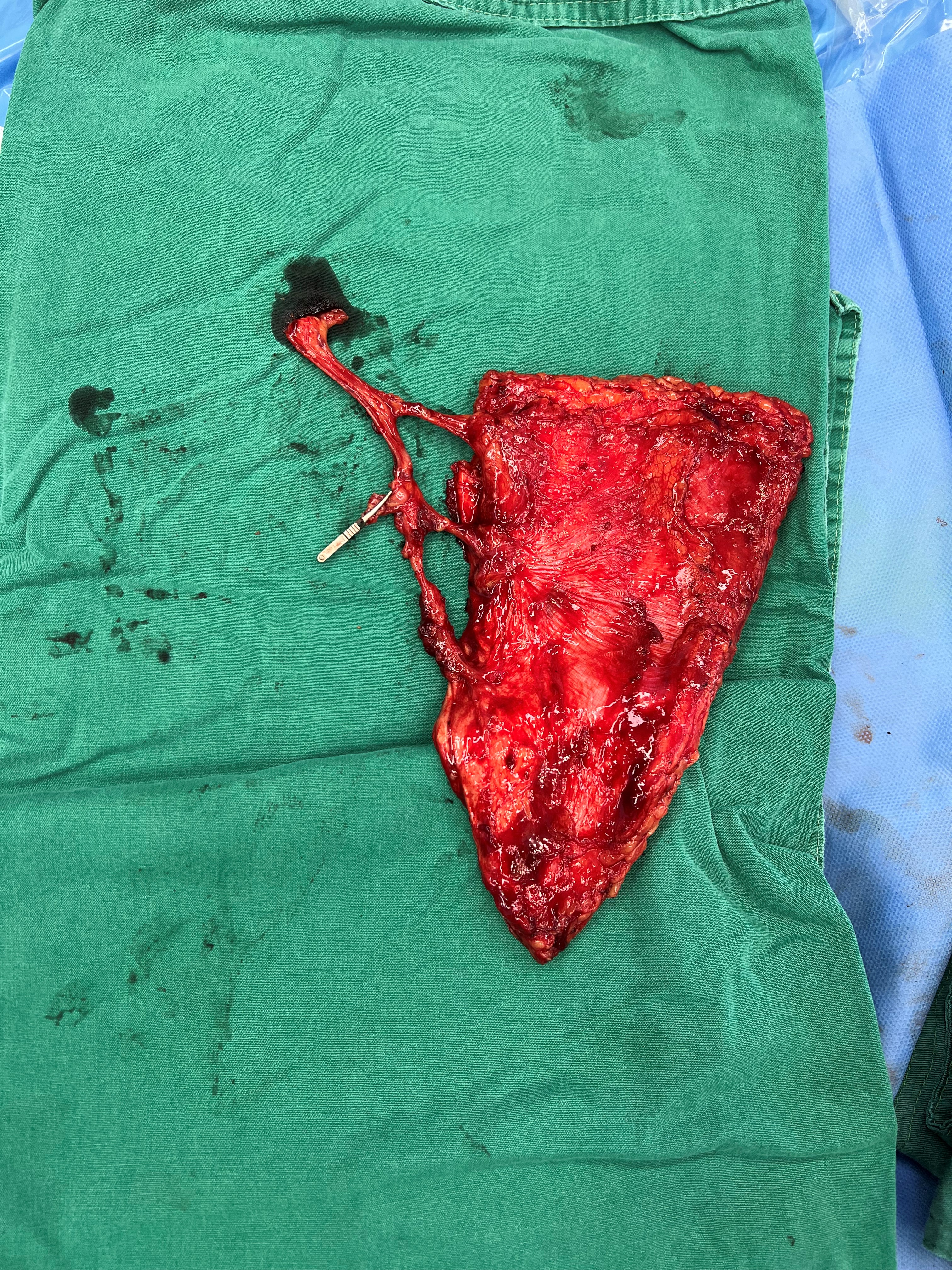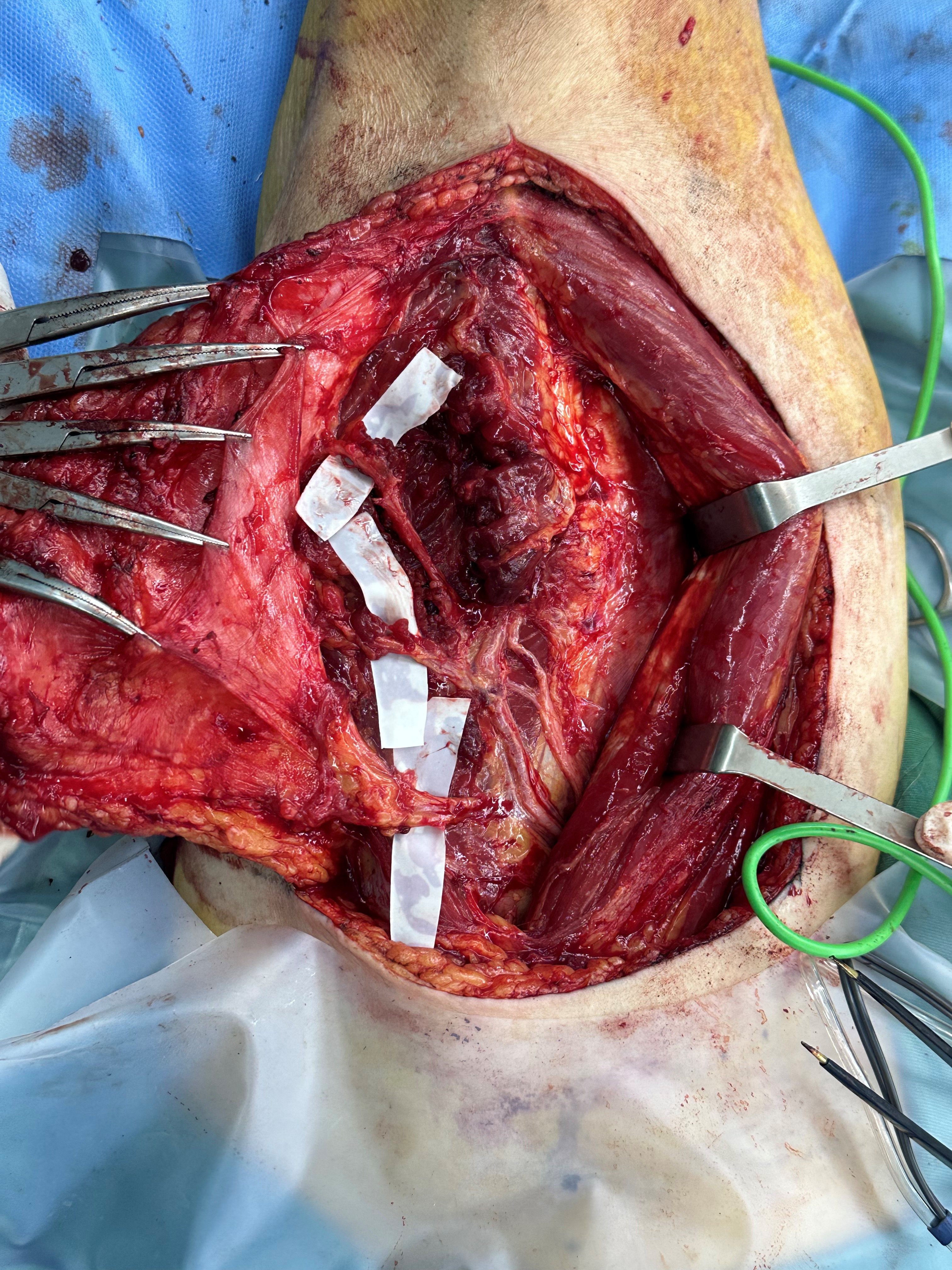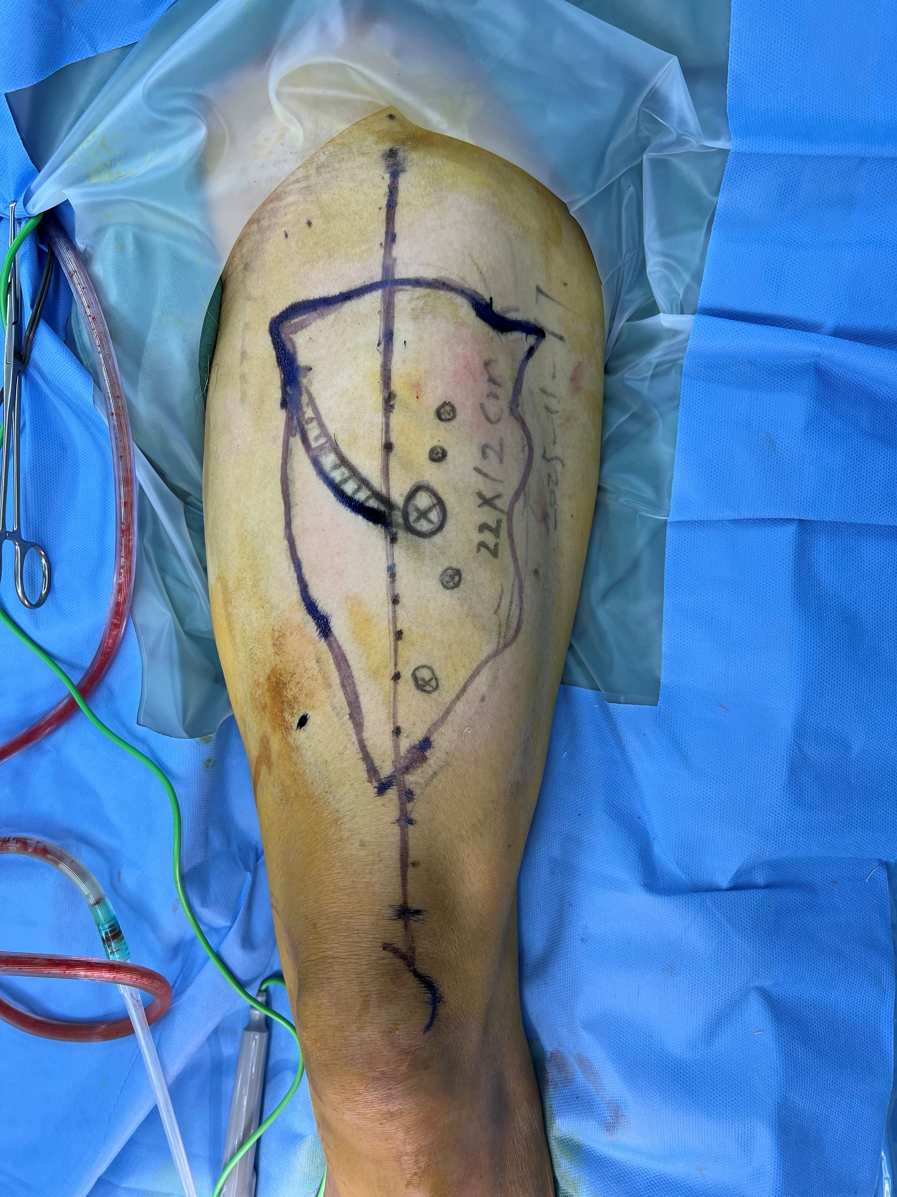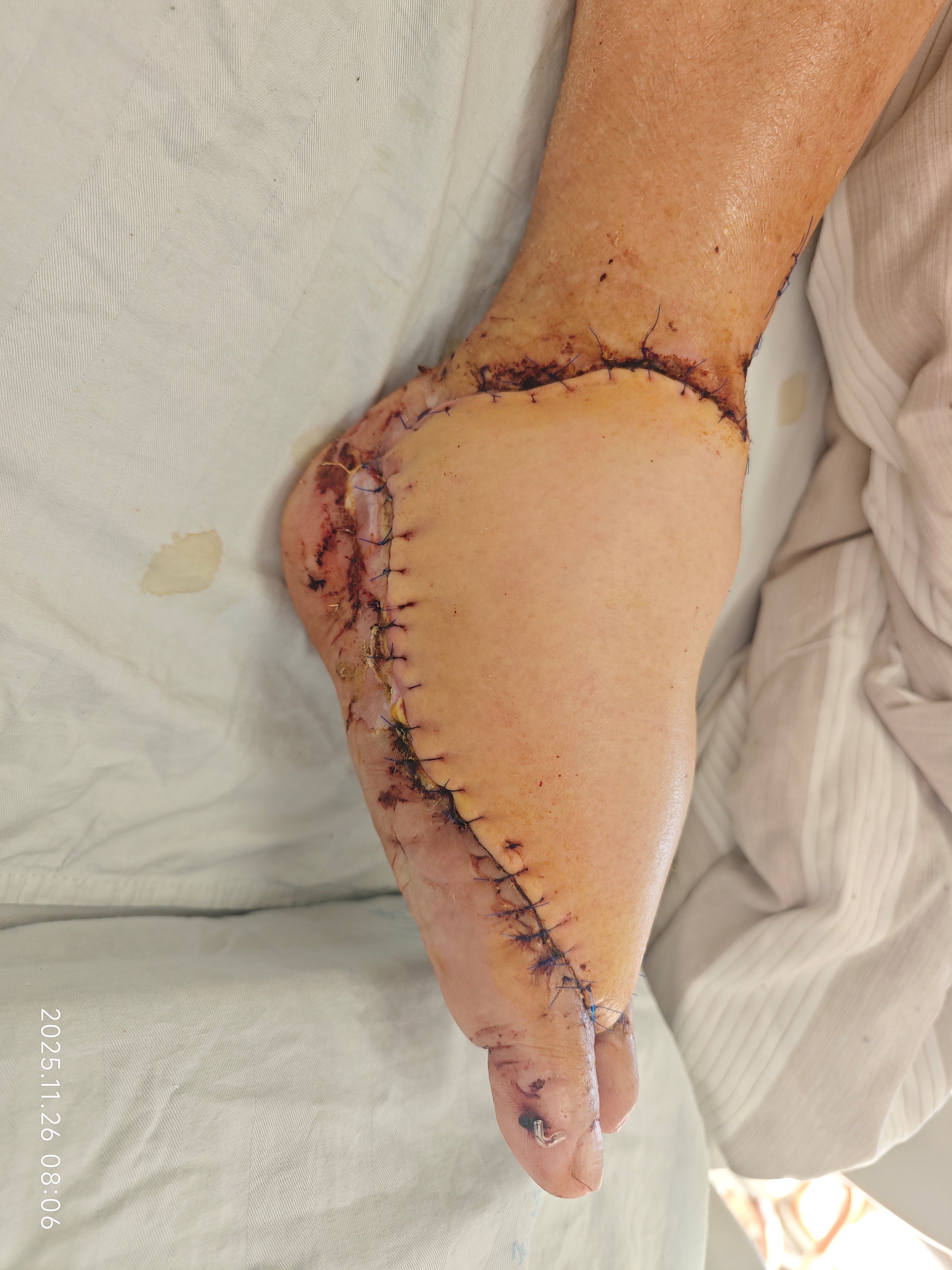 第一例手术,患者为73岁男性,团队为其实施高龄游离股前外侧皮瓣修复术。患者术前CTA提示血管硬化显著,患侧血管显影远差于健侧,血管条件的先天不足不仅大幅提升了显微吻合的操作难度,更让术中血流调控、术后抗痉挛抗凝护理充满不确定性,每一步都考验着团队的精准把控力。手术团队针对患者血管条件受限的特点,精确设计皮瓣,术中通过显微技术完成血管及神经吻合,并实时监控血流变化。术后团队对患者进行抗痉挛、抗凝及循环改善护理,皮瓣血运稳定,无感染或坏死迹象,患者恢复顺利,功能及外观得到良好改善。