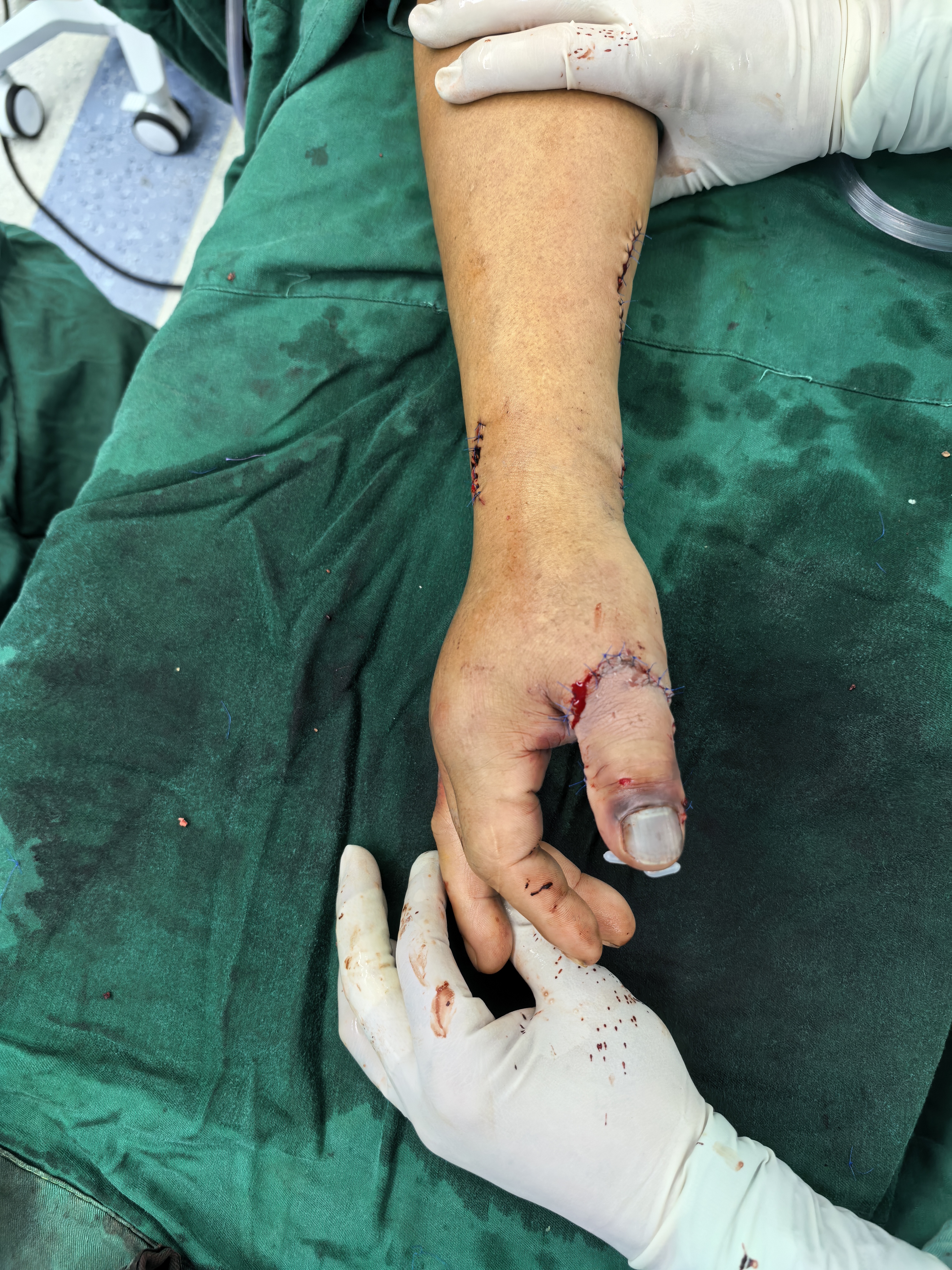 第二例手术,患者为61岁男性,右手拇指完全离断,拇长屈肌腱从前臂完整撕脱抽出,双侧指神经呈鼠尾状撕裂,于近节基底部彻底离断,离断指体挫伤淤青明显,指腹皮肤还伴横行裂伤。拇指暴力撕脱导致血管床严重破坏,吻合难度级数式增加,术后血管痉挛、栓塞的风险极高,容错率极低,几乎为零。搅拌机撕脱离断伤修复术堪称“极限挑战”。手术团队在极高风险条件下完成血管吻合、神经修复及肌腱重建,同时进行指体皮肤修复。术中多次评估血流,防止血管痉挛及栓塞,术后实施精准抗凝及感染预防护理。患者拇指血运稳定,指体皮肤及功能逐步恢复,肌腱及神经修复效果良好,并已开始进行功能训练。