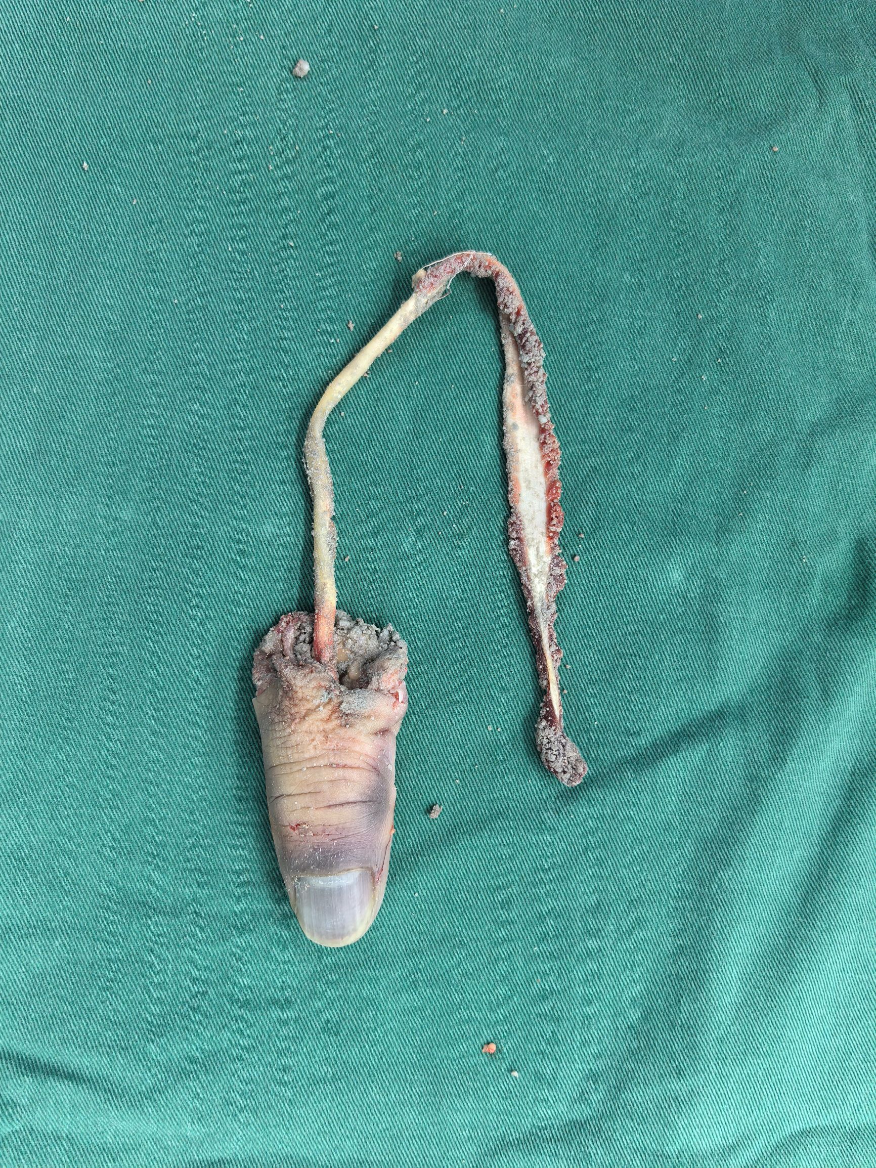 图片可能会引起不适:患者中指撕脱离断图1 患者中指撕脱离断图2