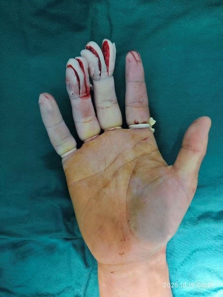 凌晨2点,朱先生在操作绞肉机时意外伤及右手。刹那间,撕裂般的剧痛席卷而来,只见掌心鲜血淋漓——中指与环指破碎的组织绽开。来不及细想,他简单包扎后便紧急赶往苏大附四院急诊。