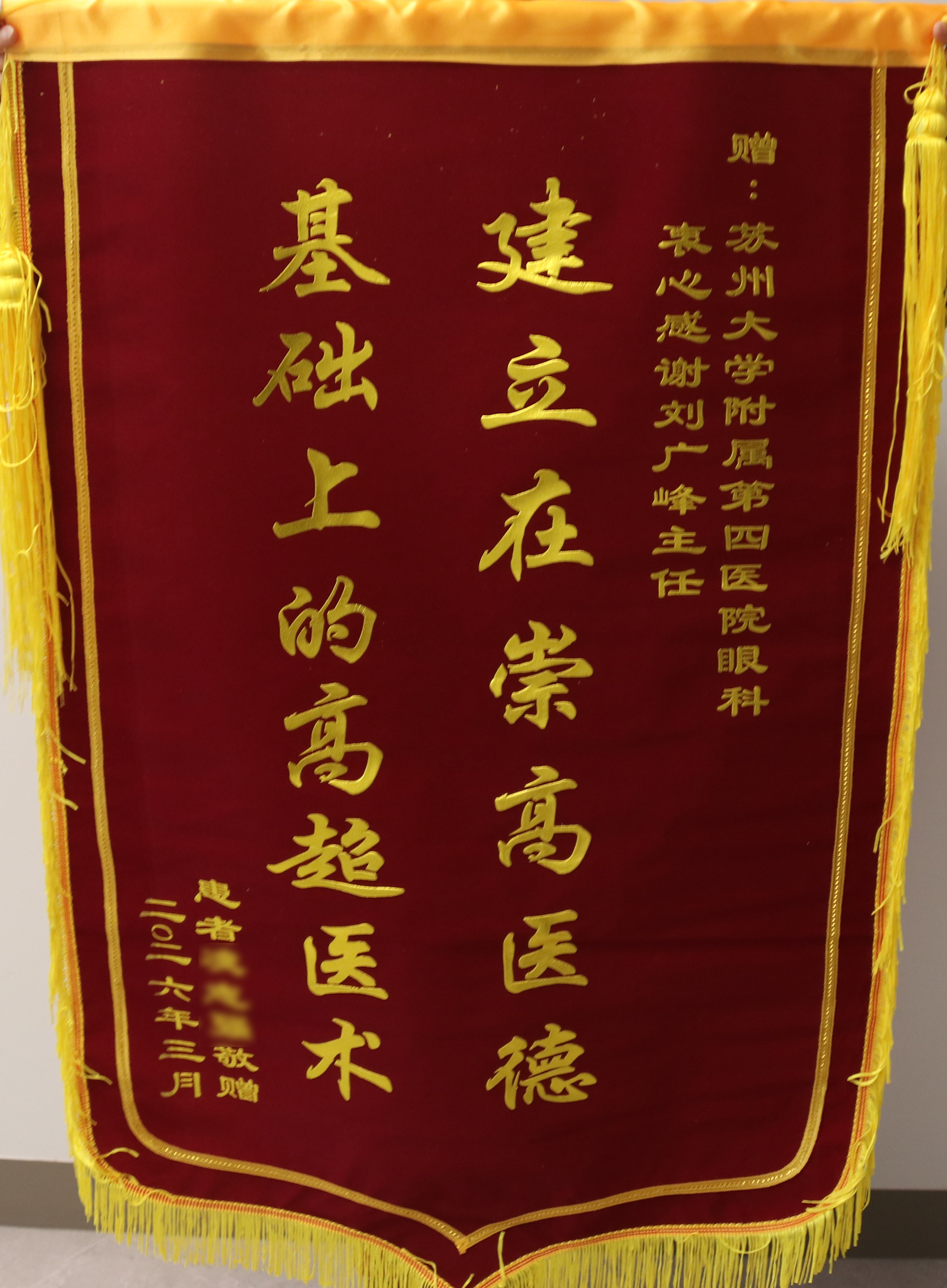 患者凌先生家属赠送锦旗感谢我院眼科刘广峰主任医师、许瑶副主任医师