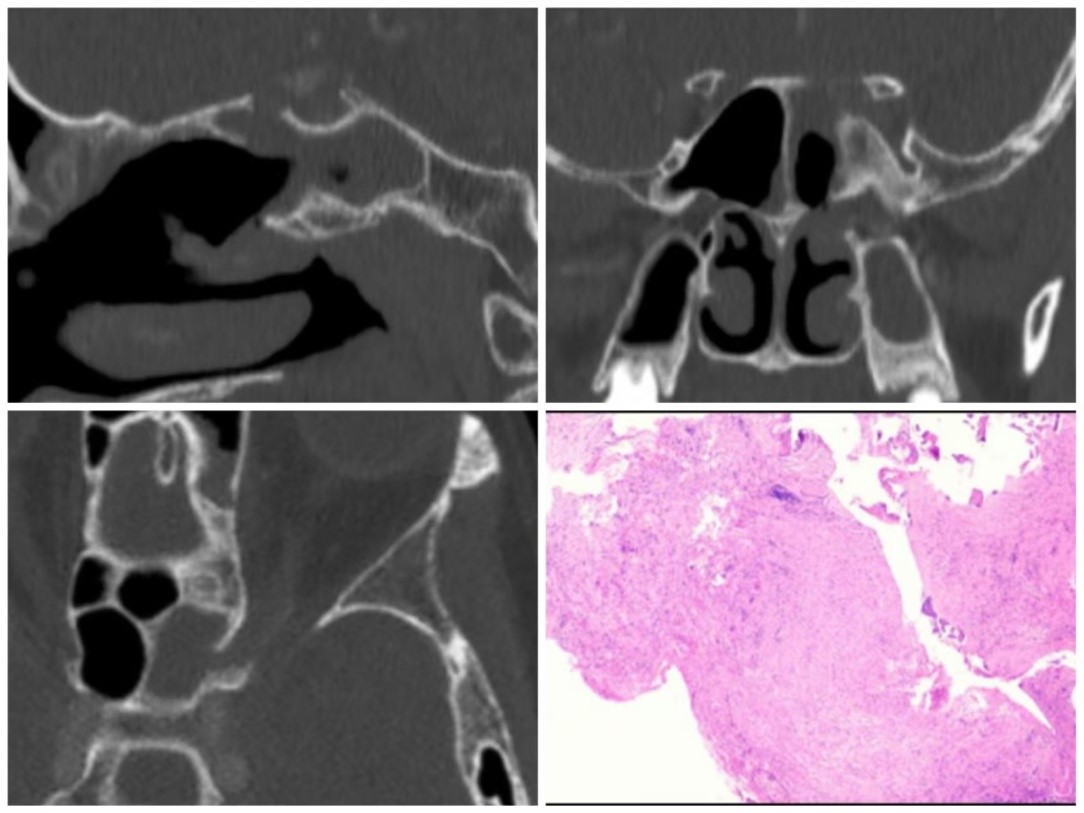 我院鼻颅底专业医疗团队在王德辉教授的带领下,迅速开展多学科会诊,综合多方意见,精准研判、周密制定手术方案,采用内镜微创技术,精细切除视神经周围及鼻颅底受霉菌侵犯的病变组织。与此同时,视神经减压术同步实施,精准清除病灶、解除视神经压迫,最大程度保护正常组织与神经功能,并给予患者抗真菌治疗。术后,患者头痛已基本缓解,病理报告证实急性侵袭性霉菌病,视神经受真菌侵蚀。